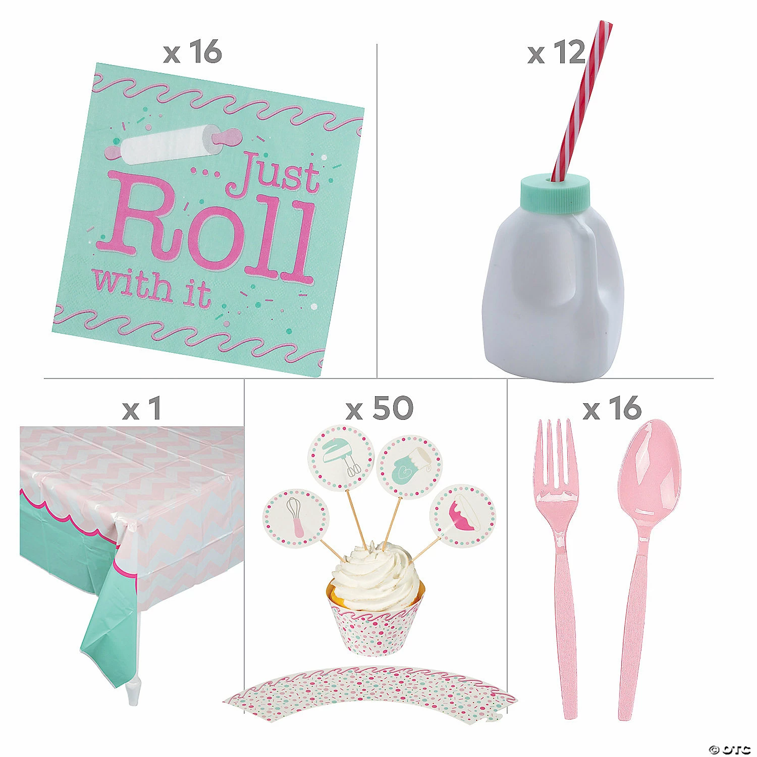 Getting everything you need for a party of eight all at once certainly isnβt a half-baked idea β itβs a smart one! This fun kit has all the disposable tableware needed for a baking party of up to eight guests and includes party decorations. Donβt miss all the other great baking-themed party supplies available here on this website! (159 pcs. per unit) Assortment may vary.Includes:β’ 1 Plastic 1st Birthday Pink Elephant Tablecloth (54″ x 108″ Thin, slightly transparent. Disposable.)β’ 100 Paper and wood Baking Party Cupcake Wrappers & Picks (Wrappers, 8 1/4″ x 3 1/4″; picks, 5″.)β’ 6 Cardstock Baking Party Cutouts (21 3/4″ x 15 3/4″)β’ 8 Paper Baking Party Dinner Plates (9″)β’ 16 Paper Baking Party Luncheon Napkins (6 1/2″)β’12 Plastic Mini Milk Carton-Shaped Cups with Straws (3 3/4″ 6 oz.)β’ 8 Plastic Pink Fork & Spoon Cutlery Sets (Each set includes fork and spoon.)