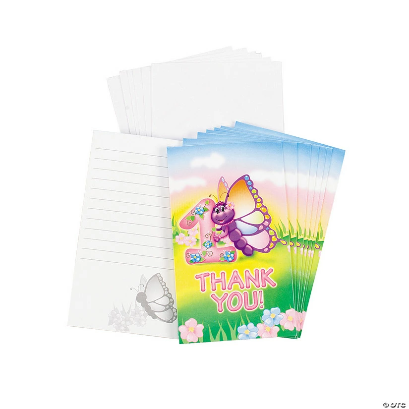 Butterfly 1st Birthday Thank You Cards. Say a very special thank you to your guests with these colorful butterfly 1st birthday thank you notes. Cards are printed with βThank Youβ and feature a cute butterfly in an enchanted flower garden. Includes 8 cards with envelopes. Β© OTC