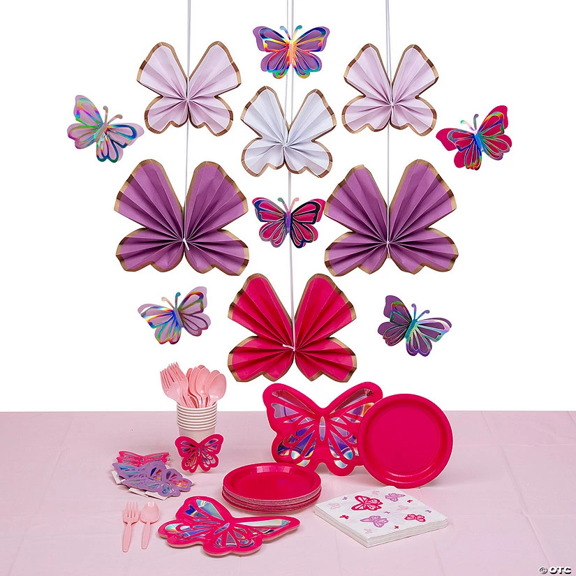 This bright and colorful butterfly party kit is the perfect, convenient solution for your little one’s butterfly-themed birthday party! With enough tableware for 8 guests and a few party decorations, this all-in-one party kit will save you time and money! Find more butterfly party supplies throughout our site for an added touch. (85 pcs. per unit) Assortment may vary.Includes:β’ 6 Cardstock 3D Butterfly Cutouts (12″)β’ 8 Paper Butterfly Cups with Sleeves (3 3/4″ 9 oz.)β’ 16 Paper Napkins (6 1/2″ Not microwave safe.)β’ 6 Paper Butterfly Wing Hanging Fans (10″ – 14″)β’ 8 Paper Butterfly-Shaped Dinner Plates (9″)β’ 24 Paper Dessert Plates (7″)β’ 16-Pc. Plastic Pink Fork & Spoon Cutlery Setβ’ 1 Plastic Tablecloth (54″ x 108″)