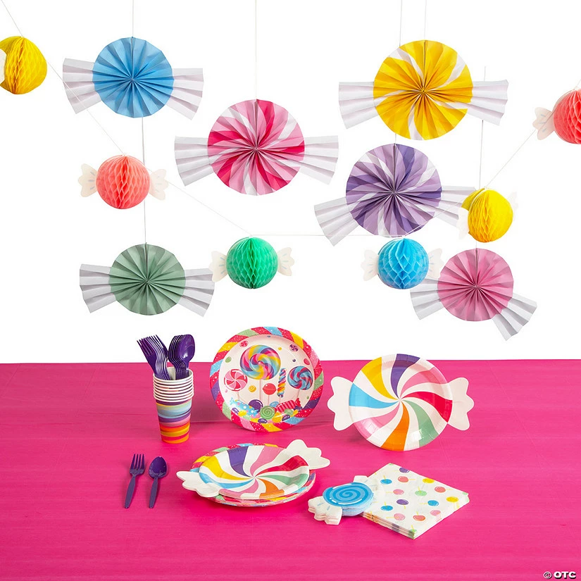 Invite friends over for a sweet Candy World party with the help of this impressive tableware kit. Featuring enough disposable tableware and decorations for up to eight people, this kit makes the task of hosting a Candy World birthday party much easier! You bring the guests and the cake and weβll take care of the rest. (72 pcs. per unit) Assortment may vary.Includes:β’ 8 Paper Candy World Dessert Plates (7 1/2″)β’ 8 Paper Candy World Dinner Plates (9″)β’ 16 Paper Candy World Luncheon Napkins (6 1/2″)β’ 8 Paper Candy World Cups (3 3/4″ 9 oz.)β’ 6 Candy World Paper Hanging Fans (Three 14″ x 7″ and three 14″ x 21 1/2″. Simple assembly required.)β’ 1 Paper Candy World Party Honeycomb Garland (7 ft.)β’ 16 Paper Candy-Shaped Candy World Beverage Napkins (5″)β’ 1 Plastic Hot Pink Tablecloth (54″ x 108″ Thin, slightly transparent. Disposable.)β’ 8 Plastic Purple Fork & Spoon Cutlery Sets (16 pcs. per unit)
