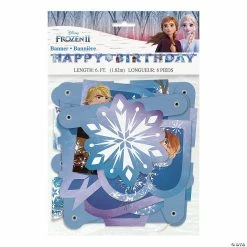 Wish your little princess a happy birthday Frozen-style! This Frozen 2 party decoration features Anna, Elsa, Kristoff, Sven and Olaf β and plenty of snowflakes! Add this birthday banner to your Frozen party supplies and check out more winter princess essentials on our website. Paper. 6 ft. Β© Disney