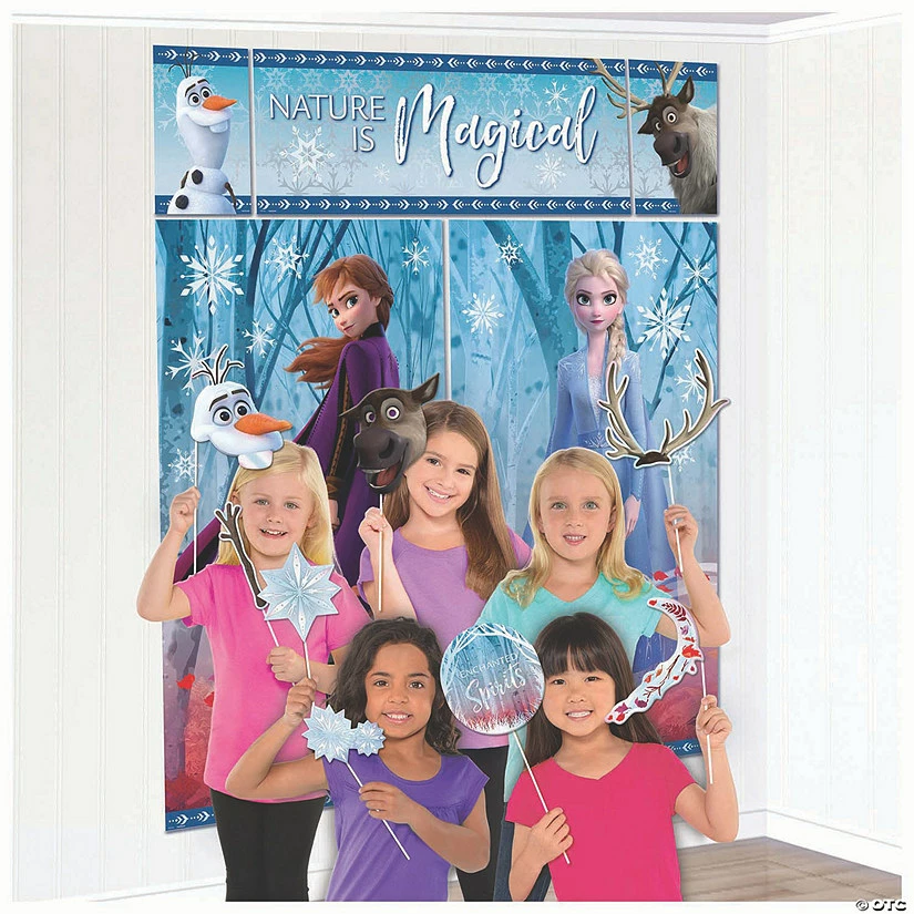 If you’re planning a Frozen 2 birthday party, make sure you capture plenty of photo ops with the help of this Frozen scene setter complete with photo stick props! The large banner is printed with “Nature is magical” and features a variety of snowflakes. Find more Frozen 2 party supplies and decorations throughout this site. Includes: 1 banner (44″ x 16″), 2 large posters (32 1/2″ x 59″), 2 small posters (10″ x 16″) and 12 photo booth props. Β© Disney