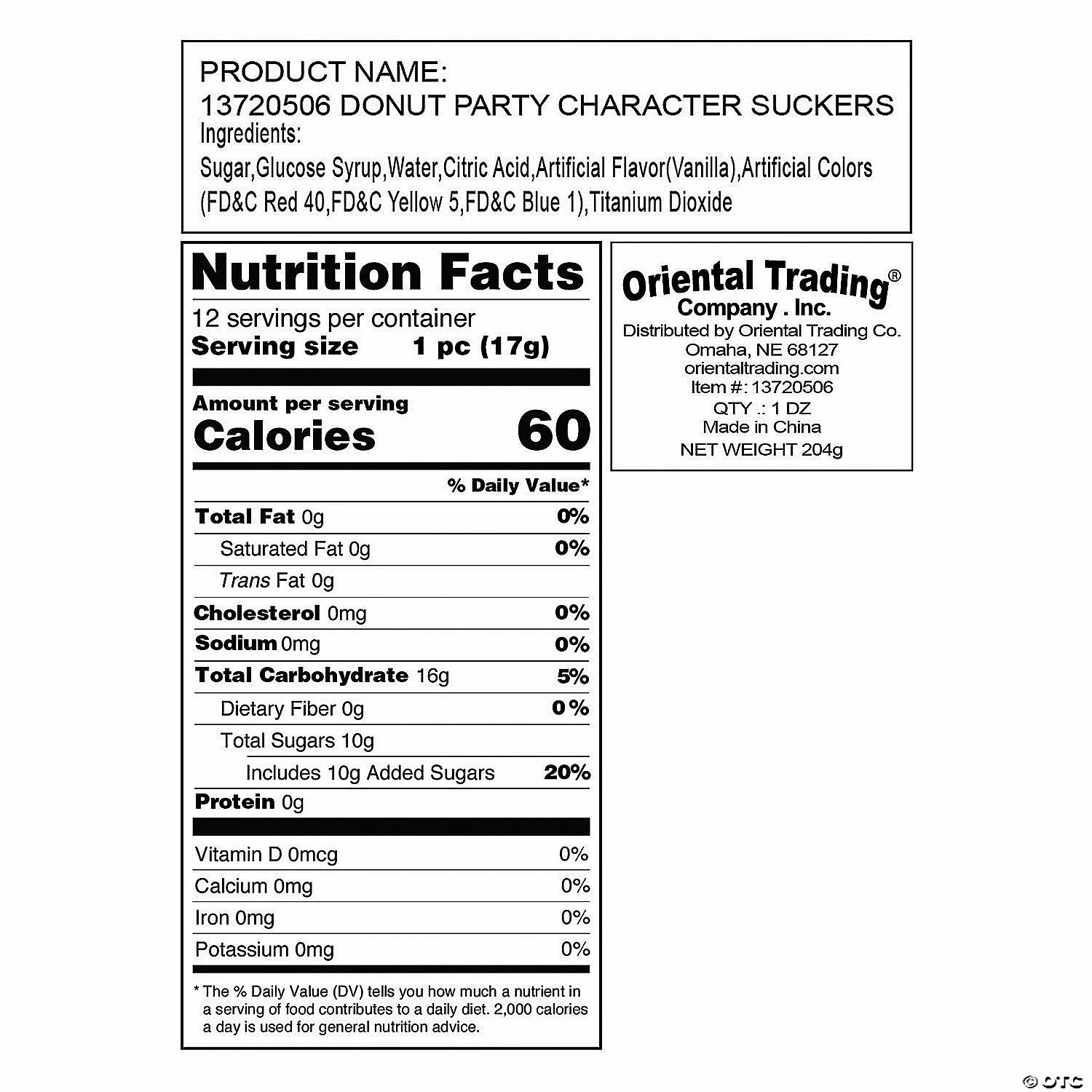 โข What’s Included: The set includes 12 vanilla flavored lollipops that are shaped like donuts and are individually wrapped in decorative donut packaging. โข Non-Returnable: Candy is non-returnable. For more information, visit the Return Policy page located on our website.โข Important Country of Origin Information: For certain items sold by OTC on our Web or Mobile sites, country of origin information can change and what is displayed may not be accurate or consistent with manufacturer information. For up to date country of origin information, it is recommended that you rely on product packaging or other manufacturer information.โข Product Information: These donut suckers are dairy-free, gluten-free, nut-free and fat-free. Details about ingredients, nutrition, allergens and other product information are provided on our Web and Mobile sites for reference purpose only, without warranty or representation as to accuracy. Manufacturers adjust their labeling regularly and are solely responsible for the accuracy of the information. For general questions concerning these items, please contact our customer service at 800-228-0475.Product Description: Mmmm….donuts. Donut parties are a thing and these donut sprinkles lollipops are a combination of two favorite sweet treats. This set includes a dozen vanilla flavored donut suckers that are individually wrapped in decorative donut packaging. Style them in decorative glass jars for a candy buffet or tuck into goody bags. Specs:Size: 2″ lollipop, 4″ stickQuantity: 12 lollipopsDietary needs: Dairy-free, Gluten-free, Nut-free, Fat-freeBrand: ยฉ OTC – Oriental Trading Company