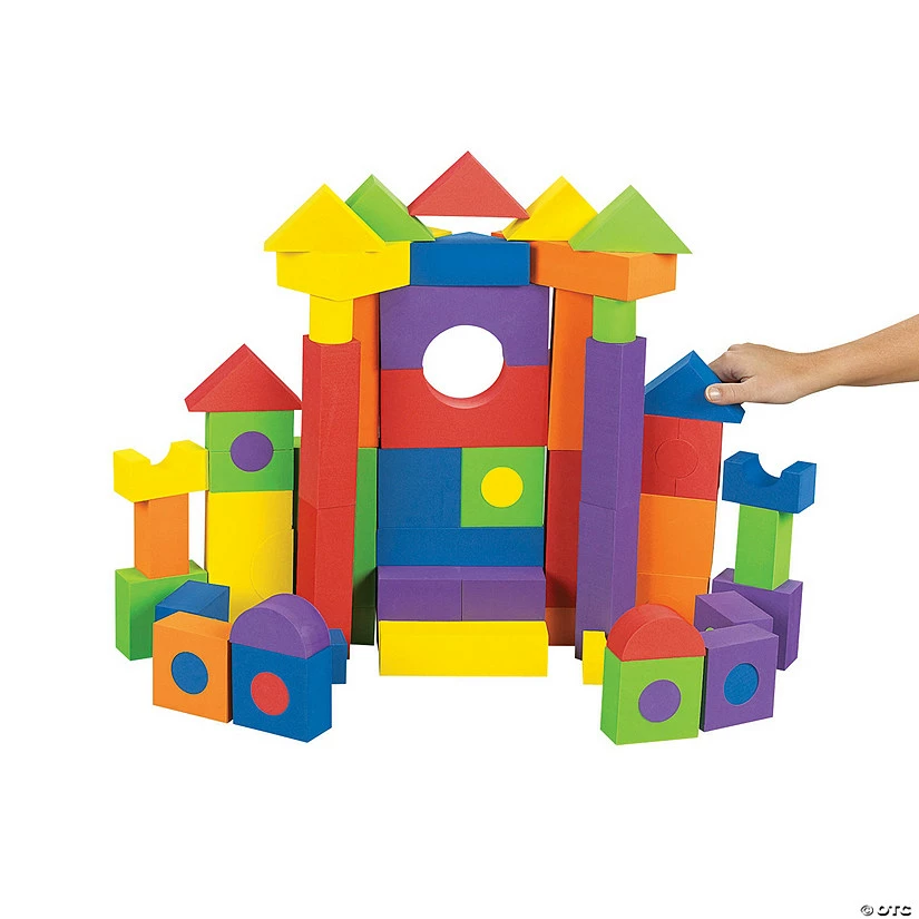 In 6 vibrant colors and 10 geometric shapes, this pack of 68 lightweight foam building blocks is βstackedβ with fun! Give them to your lil’ architects to build castles and forts in your playroom! A great indoor activity for the whole family. (68 pcs. per unit) 1 5/8″ – 6 1/2″