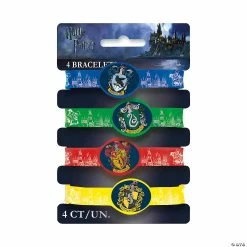 Featuring the Ravenclaw, Slytherin, Hufflepuff and Gryffindor crests, these Harry Potter wristbands are a bewitching addition to your Potter party supplies! Sort your party guests into the different houses and use these rubber bracelets to identify the teams for party games like an on-the-ground Quidditch game. This novelty jewelry also makes great Potter party favors! Rubber. (4 pcs. per unit) 3 1/2″ x 5 1/4″ card. ™/© Warner Bros. Entertainment Inc.