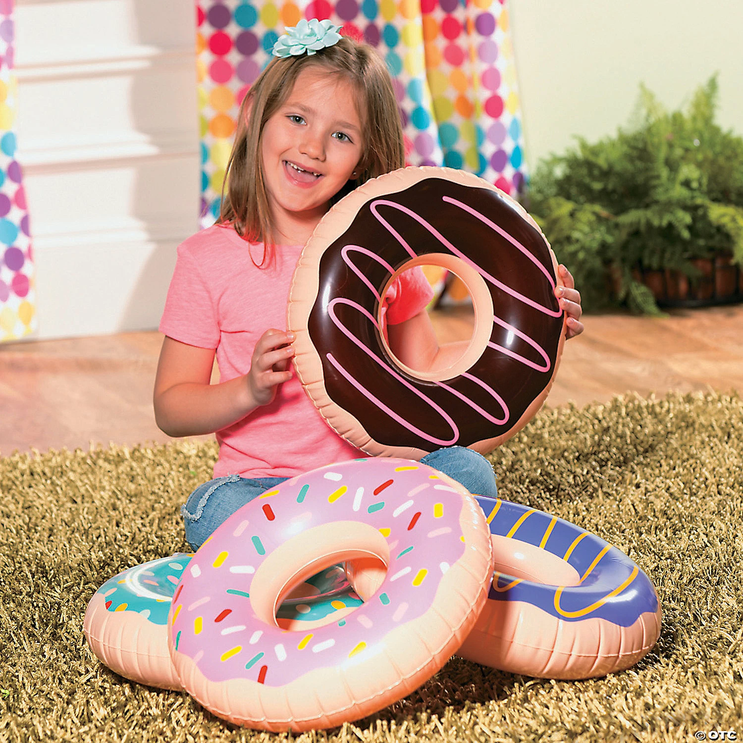 Satisfy your craving for some fun with these sweet Inflatable Donuts. With bright designs including frosting and yummy sprinkles, these delightful donuts are a great addition to your donut birthday party or summertime pool party. Blow them up and use these inflatable toys as party decorations, party favors or place them in your pool and have kids toss balls into the holes for an easy party game. Vinyl. Inflated, 15″ with a 5″ hole. Not a floatation device. Β© OTC