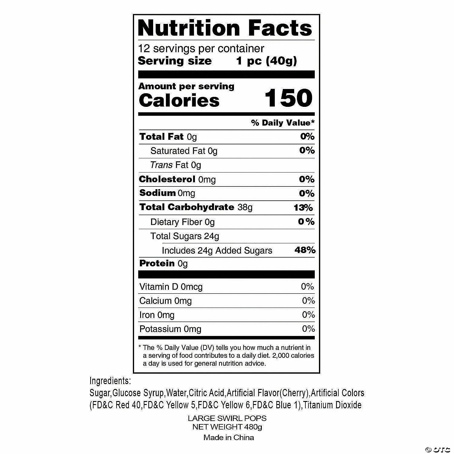 β’ What’s Included: You get 12 large, individually wrapped rainbow swirl lollipops in cherry flavor. β’ Non-Returnable: Candy is non-returnable. For more information, visit the Return Policy page located on our website.β’ Important Country of Origin Information: For certain items sold by OTC on our Web or Mobile sites, country of origin information can change and what is displayed may not be accurate or consistent with manufacturer information. For up to date country of origin information, it is recommended that you rely on product packaging or other manufacturer information.β’ Product Information: These swirled lollipops are fat-free. Details about ingredients, nutrition, allergens and other product information are provided on our Web and Mobile sites for reference purpose only, without warranty or representation as to accuracy. Manufacturers adjust their labeling regularly and are solely responsible for the accuracy of the information. For general questions concerning these items, please contact our customer service at 800-228-0475.Product Description: Sweet nostalgia! Bright rainbow colors give these large swirl lollipops their old fashioned charm. While the cherry flavor is tasty, these lollipops are big on style. They’ll draw everyone’s eye when you use them as sweet decorations in glass jars on the candy buffet at your wedding reception, carnival birthday party or circus-themed corporate event. You get a dozen individually wrapped large lollipops on plastic sticks. Your guests will love them! Specs:Size: 2 3/4″ lollipop, 6″ stickQuantity: 1 lb., 12 lollipopsDietary needs: Fat-free