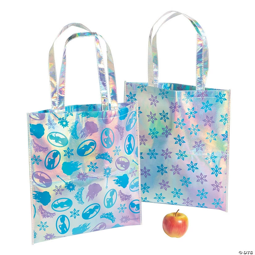 Kids will become frozen with excitement at first sight of this findโฆand thatโs even before they discover what goodies await inside! Fabulous for party favors, these tote bags feature designs of winter princesses and snowflakes in shades of icy blue and purple. Even better, each bag really shimmers and shines and is durable enough for use running errands or as storage once the birthday or seasonal celebration has come and gone. Nonwoven polypropylene. 15″ x 17″ with 11″ handles. ยฉย OTC