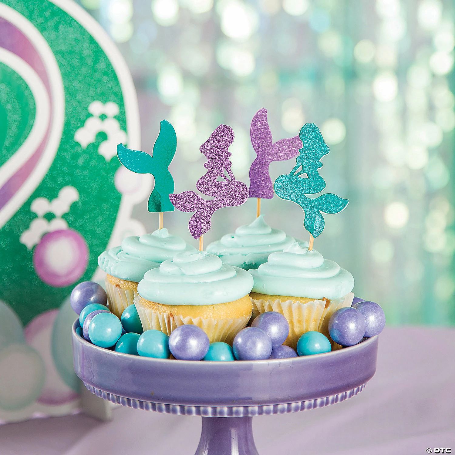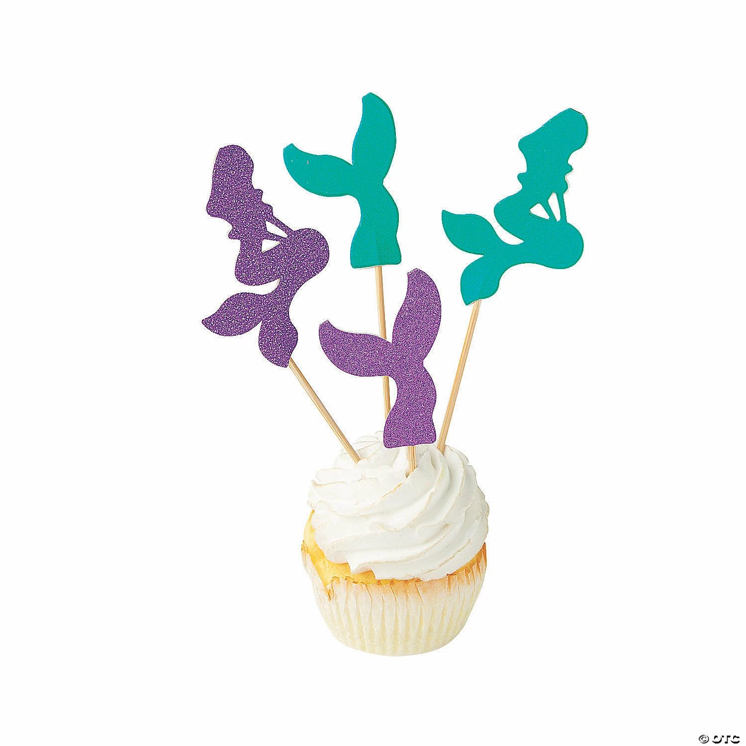 Just what you need to add a splash of shimmer and shine to your soirรฉe! Perfect for party supplies, these mermaid-shaped food picks feature aquatic hues of teal and purple. From serving up appetizers to desserts, these can be used to jazz up finger foods, cupcakes, cheese cubes and more. Beautifying your under-the-sea spread has never been so easy! Paper. (2 dozen per unit) 3″ icons on 3″ wooden sticks.