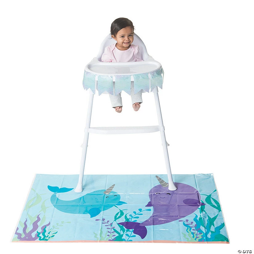 Celebrate your little one in icy-cool style that makes a splash! Perfect for party supplies, this high chair decorating kit features colorful designs of blue hues along with a smiling narwhal or two. If youβre hosting a first birthday bash centered around this adorable sea animal, youβll want to use these accents to adorn the guest-of-honorβs chair. Includes a 60″ x 4-1/2″ pennant banner and a 44″ x 30″ floor mat. Plastic. (2 pcs. per set) Β© OTC