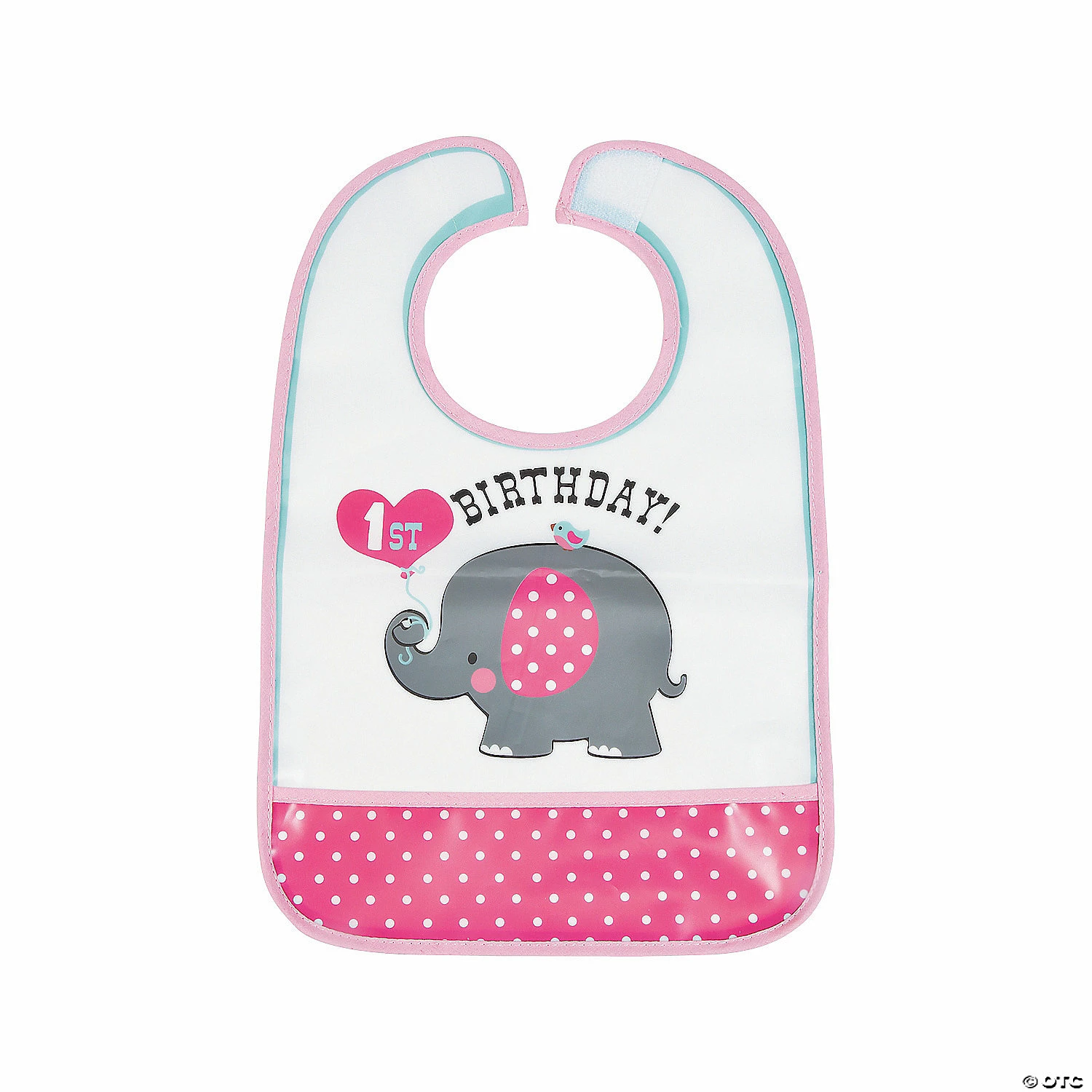 Let your little one enjoy that 1st birthday cake and leave cleaning up the mess to this Pink Elephant 1st Birthday Bib. The perfect addition to your birthday party supplies, this bib will keep your birthday girl cute and clean! Let her dig into her birthday cake and make a picture-worthy mess that you’ll never forget! Includes a pocket for catching crumbs and touch fasteners. Vinyl. 9 1/4″ x 13 1/2″ Β© OTC