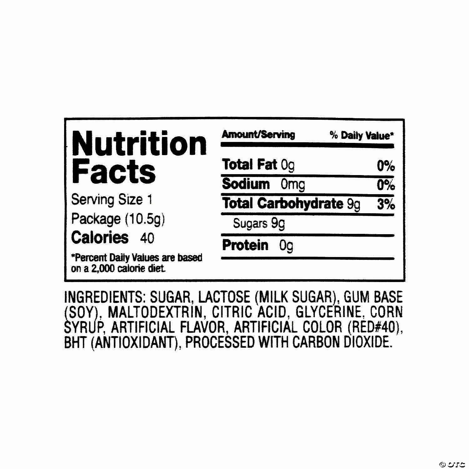 Enjoy the taste of bubble gum without any of the sticky mess! Perfect for filling goody bags at a birthday bash or any kind of celebration, Pop Rocks are a favorite among kids of all ages. Just throw a handful in your mouth and get ready to fill ’em fizz and jump about on your tongue. What kid (or adult who is still a kid at heart) wouldn’t want to give these a try? Bubble gum flavor. (24 pcs. per unit) Total wt., 7 oz. Fat-free.โข Candy is non-returnable. For more information, visit our โReturn Policyโ page located on our website.โข Ingredient, nutrition, allergen and other product information are provided on our Web and Mobile sites for reference purpose only, without warranty or representation as to accuracy. Manufacturers adjust their labeling regularly and are solely responsible for the accuracy of the information. For general questions concerning these items, please contact our customer service at 800-228-0475.