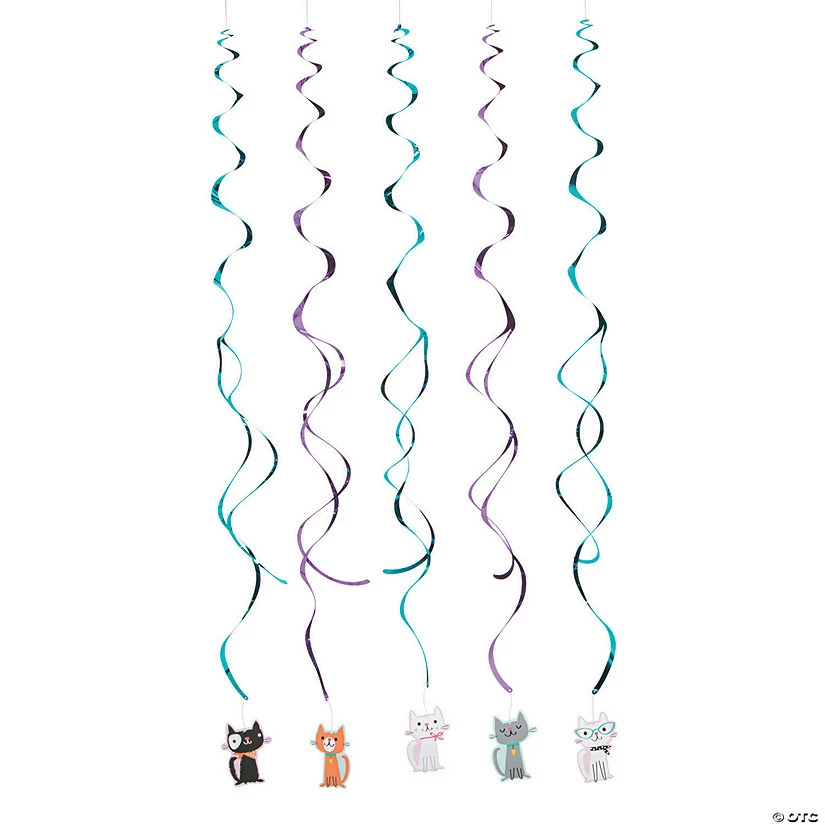 Nothing’s better than a bunch of kitties hanging around! With these Purr-Fect Party Hanging Swirls, you’ll have five fun felines at your party. A great addition to cat party decorations, these swirls are simply cat-tastic. All of your party guests will say “MEOW!” Find more Purr-Fect Party supplies elsewhere on this website. Foil and cardstock. (5 pcs. per unit) Hangs approx. 39″.