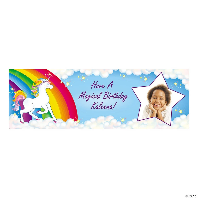 Unicorn Custom Photo Banners. Make all their birthday wishes come true with a Unicorn Custom Photo Banner. Available in two sizes, this vinyl party banner can be personalized with a special message and photo of the birthday person.