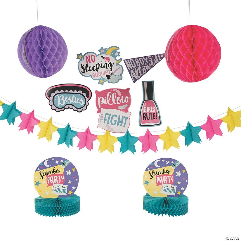 Throw an epic slumber party with the help of these party decorations! Featuring cutouts with fun sayings like, โBesties,โ โPillow Fightโ and โNo Sleeping Allowed,โ these party supplies go well with other slumber party must-haves available on this site, including party games, sleep masks (for when they do finally pass out!) and beauty kits to do each otherโs make-up and nails. Paper. (10 pcs. per unit) Garland, 9 ft. x 5 1/2″; cutouts, 6″ – 12″ x 6 1/2″ – 12″; hanging dรฉcor, 12″; table dรฉcor, 10″ x 12″. ยฉ OTC