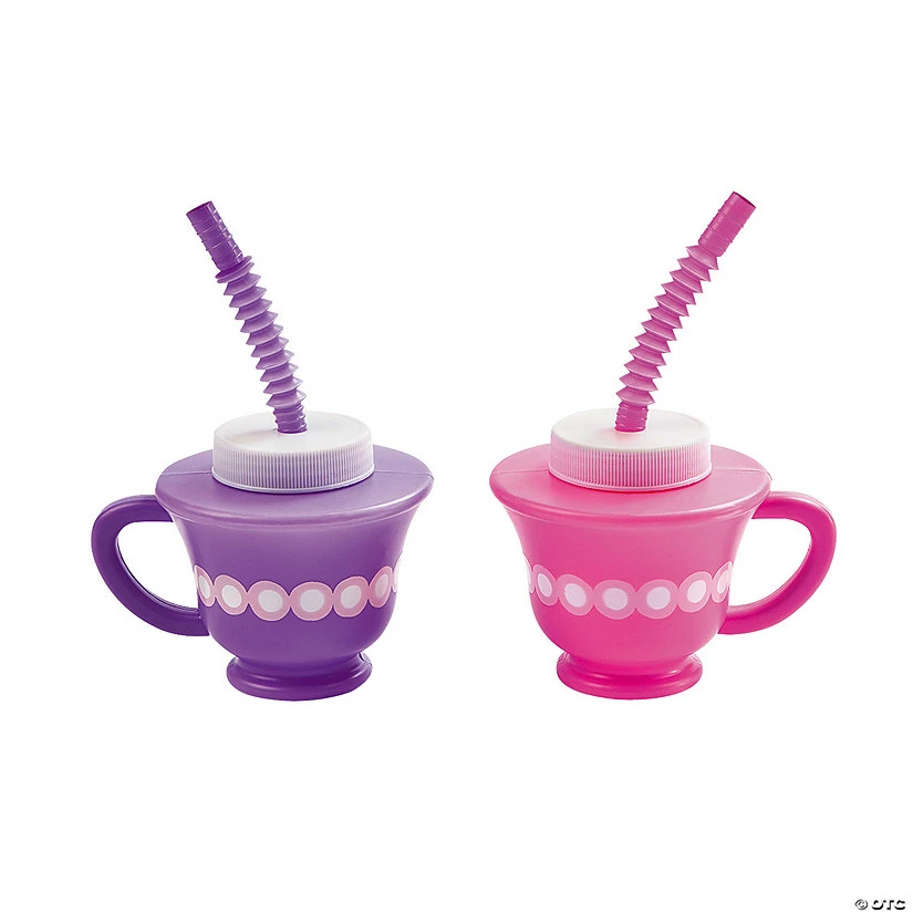 Kids will love drinking their favorite beverage out of these delightful Tea Party Novelty Cups. The perfect addition to your tea party supplies, each 8-oz. plastic cup includes a twist-top lid and flexible straw with cap so you can rest easy not having to worry about spills and messes. In purple and pink colors, these cups are sure to be a favorite favor for all your tea party guests. 3 1/2″ Β© OTC