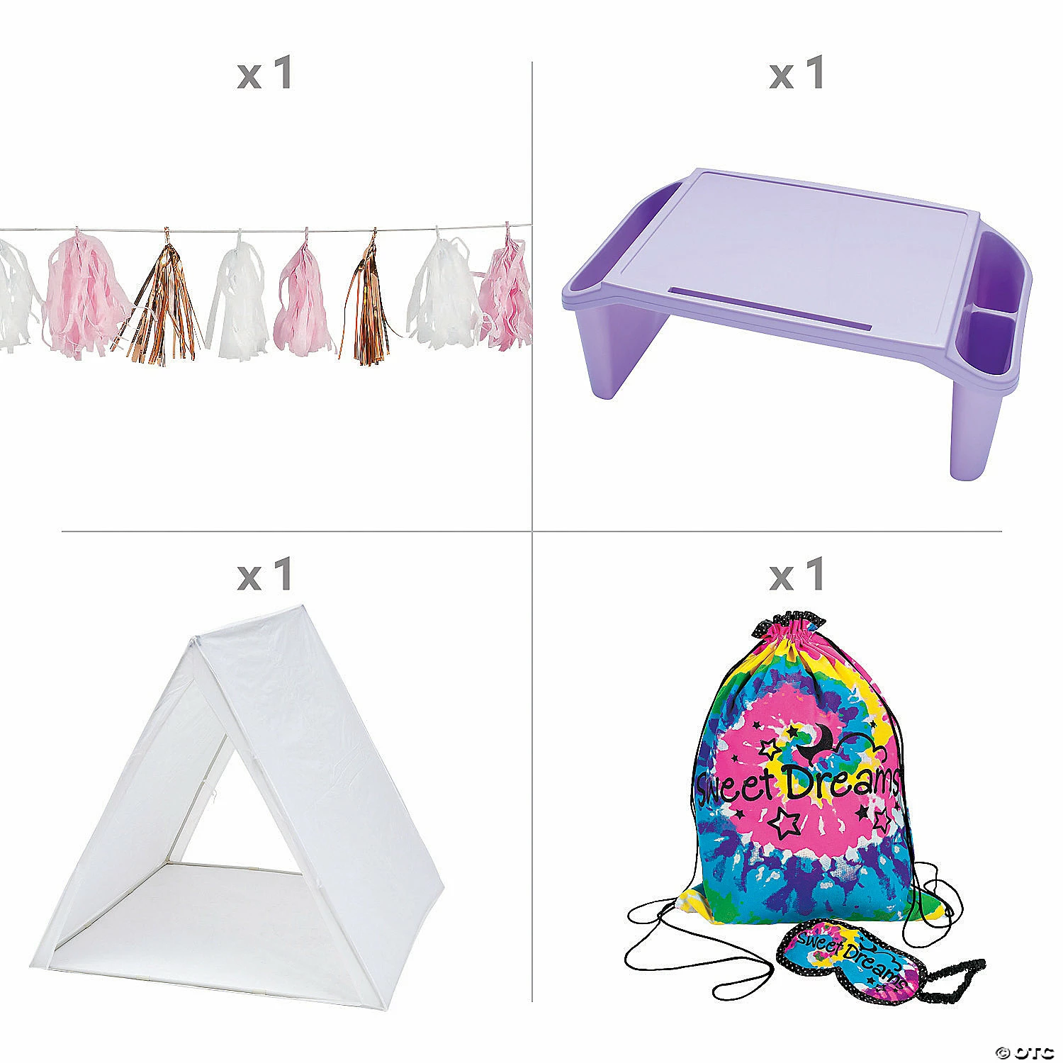 Sweet dreams are made of the right sleepover supplies! This kit comes with everything you need to have a fun sleepover party, including party decorations and other sleepover must-haves to make it a night to remember. All thatβs missing is some late-night snacks! (5 pcs. per unit) Assortment may vary.Includes:β’ 1 Blush & Rose Gold Tassel Garland (6 ft. 6″)β’ 1 Plastic Serving & Homework Tray (19 3/4″ x 8 1/4″ x 10 1/2″)β’ 2-Pc. Poly/Cotton Large Tie-Dyed Sleepover Drawstring Bag with Eye Mask Set (Bag, 12″ x 16″; eye mask, 6″ x 3″ with elastic band.)β’ 1 Nonwoven Polyester Sleepover Tent (45″ x 43″ x 40″ Simple assembly required.)