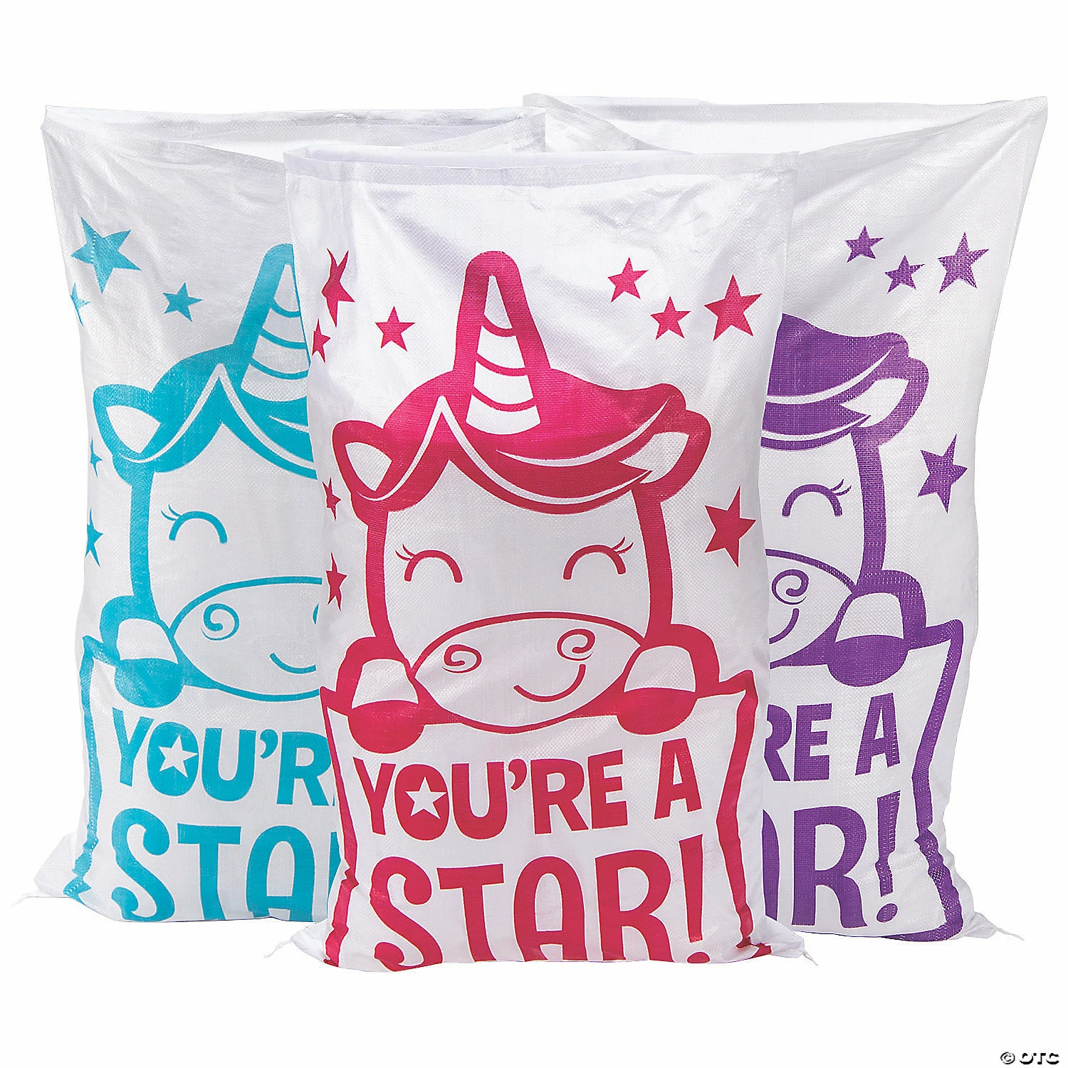 Mythological no more! Imagine your little unicorn lovers prancing to the finish line in βYouβre a Star!β potato sacks. Break away from the herd by adding this classic party game to your unicorn party supplies today. These colorful sacks coordinate with our legendary selection of exclusive unicorn party supplies and decorations. Nonwoven polyester. 23 1/2″ x 40″ Β© OTC
