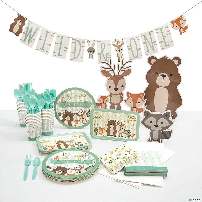 Celebrate a special first birthday party with this adorable Woodland party theme! Featuring cute and cuddly woodland animals and a mint green color scheme, this birthday party theme is great for both little boys and girls! The all-in-one kit of party supplies includes everything you need for a party with up to 24 guests. A party banner, centerpieces, tablewareβ¦ talk about one-stop shopping! (193 pcs. per unit) Simple assembly required for centerpieces. Β© OTCIncludes:β’ 24 Plastic Forks (7″)β’ 24 Plastic Spoons (6″)β’ 3 Plastic Tablecloths (54″ x 108″)β’ 24 Paper Cups (3 3/4″ 9 oz.)β’ 32 Paper Luncheon Napkins (6 1/2″)β’ 32 Paper Beverage Napkins (5″)β’ 24 Paper Dinner Plates (9″)β’ 24 Paper Dessert Plates (9″ x 5 1/2″)β’ 1 Paper Pennant Banner (7 ft. x 8 1/2″)β’ 5-Pc. Foam Centerpiece Set (4″-15″)