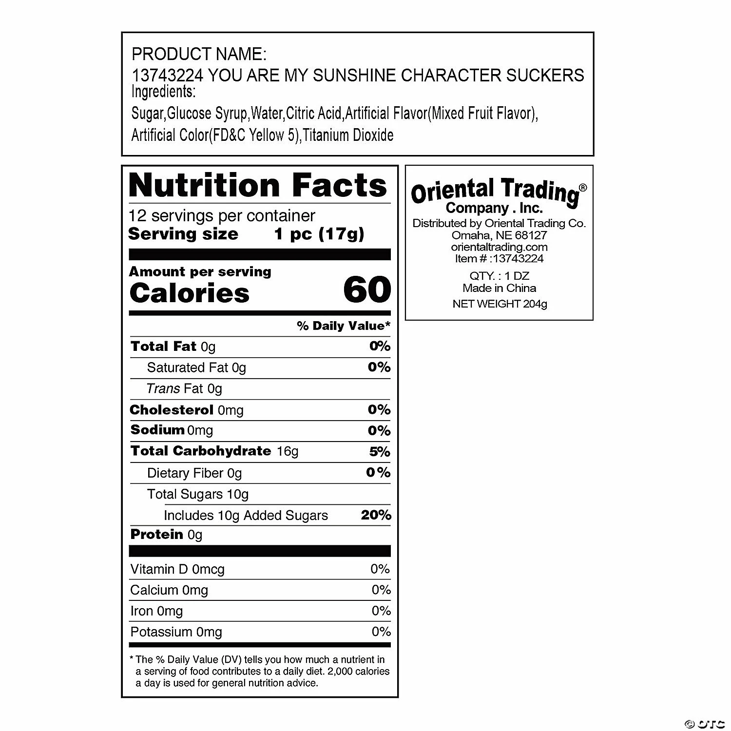 Make someone special happy when their skies are grey! These sunshine lollipops are sweet treats to perk up a friend, or add them to party favor bags. Pass them around the office as rewards to your team for a job well done. A little sugar goes a long way and this candy is a nice way to brighten anyone’s day. 2″ suckers on 4″ plastic sticks. Mixed-fruit flavor. Individually wrapped. Fat-free. Total wt., 7 oz. ยฉย OTCโข Candy is non-returnable. For more information, visit our โReturn Policyโ page located on our website.โข Ingredient, nutrition, allergen and other product information are provided on our Web and Mobile sites for reference purpose only, without warranty or representation as to accuracy. Manufacturers adjust their labeling regularly and are solely responsible for the accuracy of the information. For general questions concerning these items, please contact our customer service at 800-228-0475.